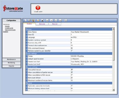 La supervisión basada en Web y las herramientas de mantenimiento proporcionan un amplio conjunto de funcionalidades para el mantenimiento del sistema storeMate MSE. Permite la configuración de cada aspecto del sistema self-scanning, incluida la configuración general del sistema, parámetros de escáner y la configuración del hardware.
