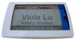 Cada etiqueta de gráfico muestra y actualiza: 1) Etiqueta de nombre 2) Departamento 3) Estado para la reunión (de permiso, de vacaciones, enfermo) y 4) Notificaciones especiales.